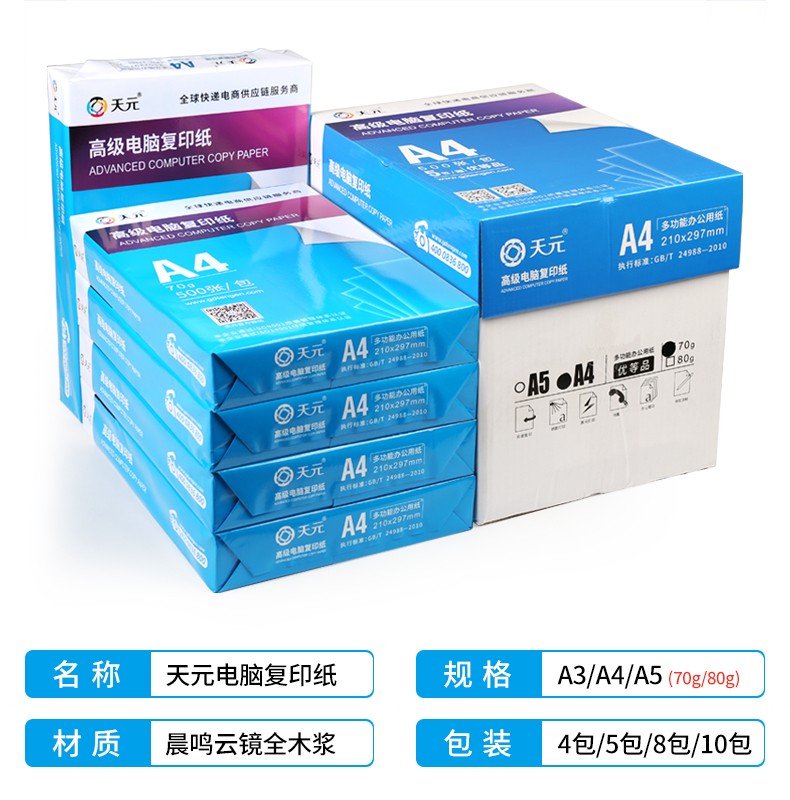 天元蓝包装复印纸 克重:70克 | 规格:A4(297*210mm) | 数量:8包/箱 货 号:KY000381