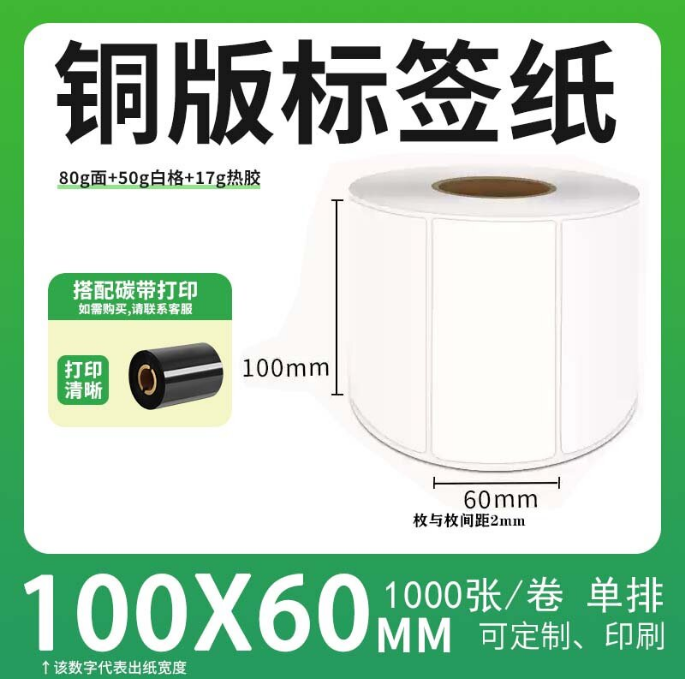 不干胶 铜版标签 空白铜版标签 白格铜版纸不干胶带裂线 100*60*1000枚/卷(单排) 货 号:KY000535