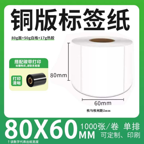 不干胶 铜版标签 空白铜版标签 白格铜版纸不干胶带裂线 80*60*1000枚/卷(单排) 货 号:KY000547