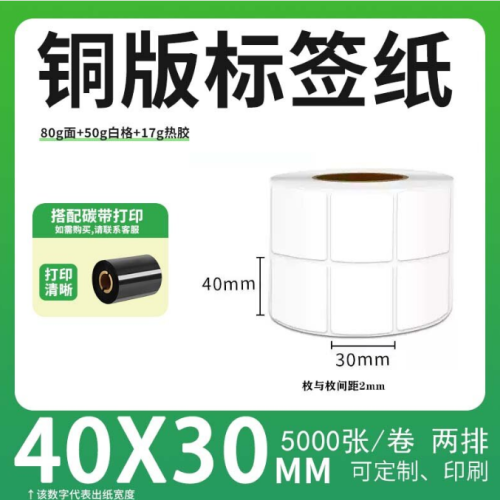 不干胶 铜版标签 空白铜版标签 白格铜版纸不干胶带裂线 40*30*3000枚/卷(2排) 货 号:KY000559