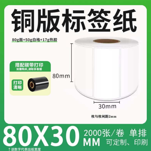 不干胶 铜版标签 空白铜版标签 白格铜版纸不干胶 80*30*2000枚/卷(单排) 货 号:KY000648
