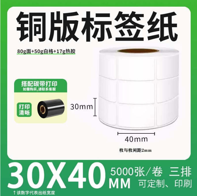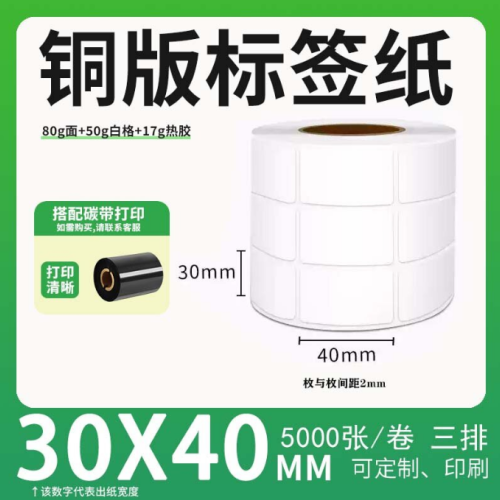 c 铜版标签 空白铜版标签 白格铜版纸不干胶 30*40*5000枚/卷(3排)