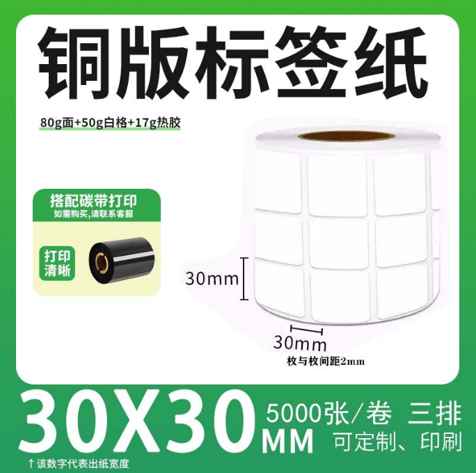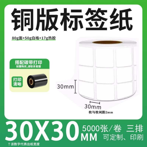 不干胶 铜版标签 空白铜版标签 白格铜版纸不干胶 30*30*5000枚/卷(3排) 货 号:KY000930