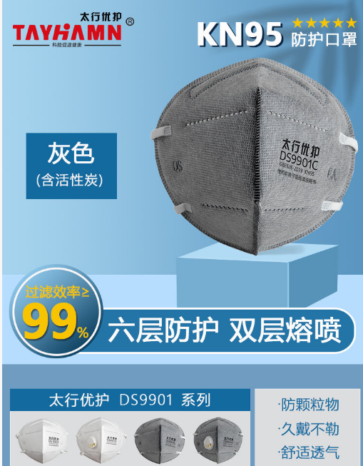太行优护 KN95防护口罩 含活性炭 型号:DS9901C | 包装方式:30只/袋*20袋/箱(即600只/箱)