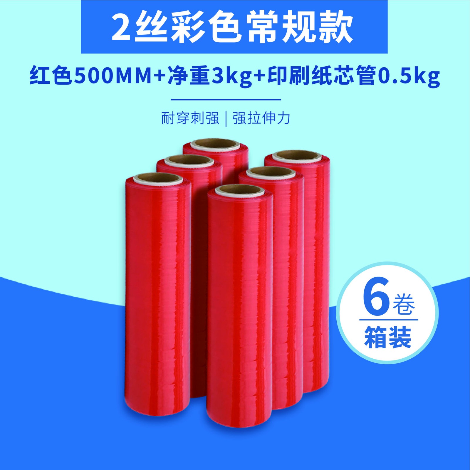 彩色缠绕膜黑色蓝色拉伸膜多色可选 红色*50cm*净重3kg+管芯0.5kg*6卷