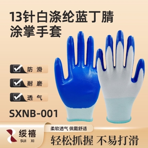 绥禧 13针白涤纶涂掌/涂指劳保手套 规格:蓝丁腈涂掌42克 | 货号:SXNB-001 | 数量:12副/打*80打/件
